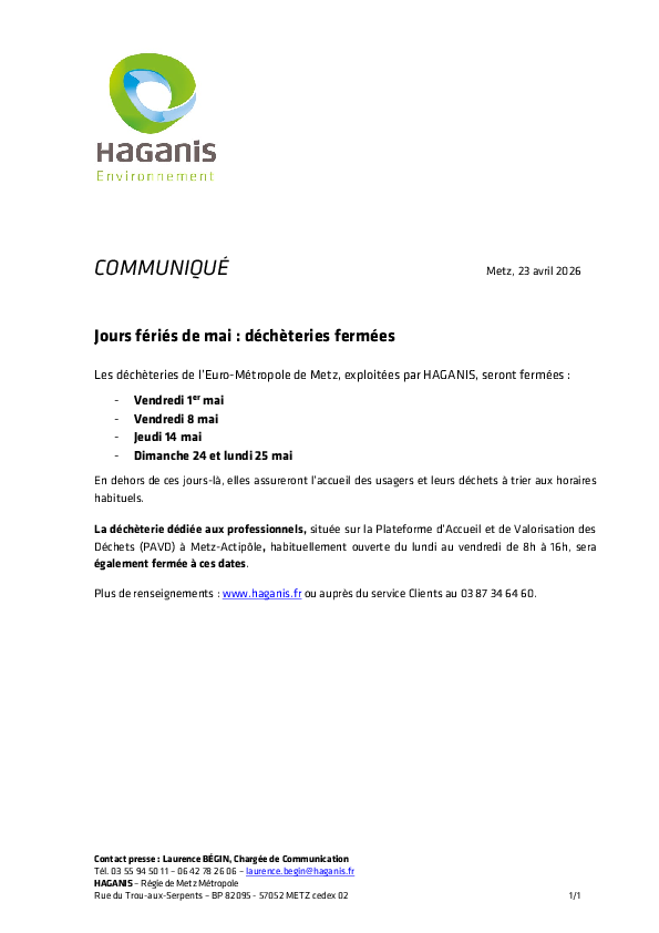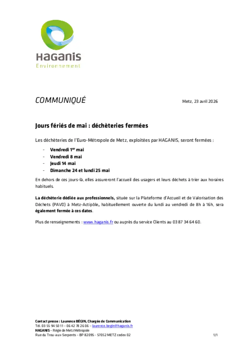 Info fermeture déchèteries jours fériés de mai